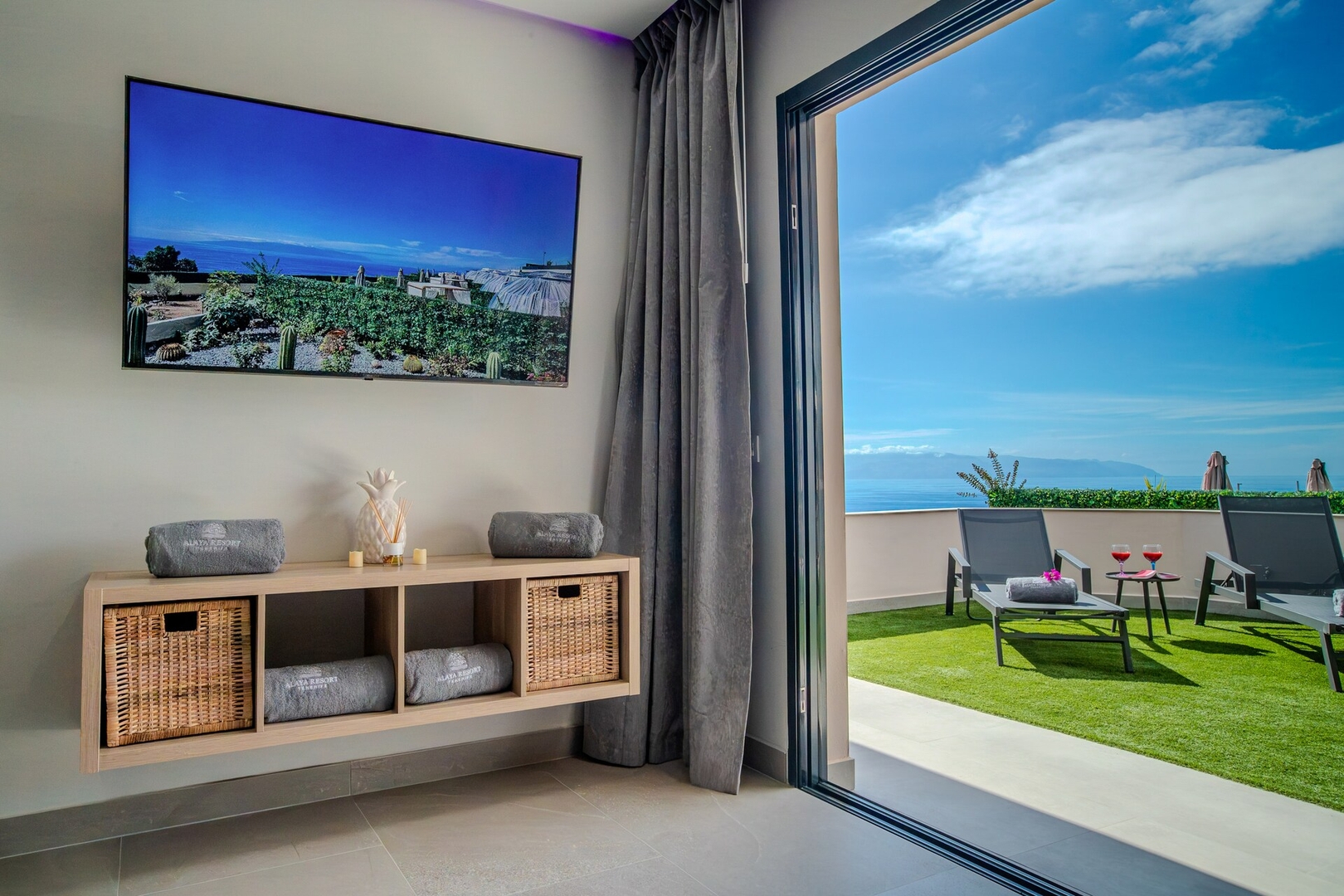 Dispone de un salón moderno con zona de comedor, cocina totalmente equipada y una terraza privada con mesa comedor, zona lounge y jacuzzi, ideal para relajarse mientras se disfrutan las vistas.